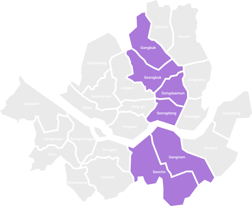 Please check the detailed fares for each type of taxi in Seoul's districts. Fares vary depending on the taxi type (standard, deluxe, jumbo) and are typically set for routes such as transfers to the airport. Fixed-rate services are available for routes within Seoul, and rates may vary depending on the type of taxi chosen.